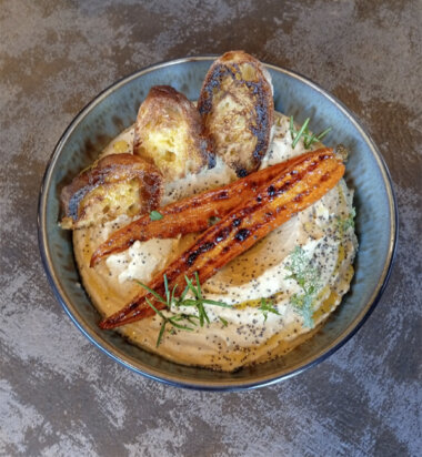 Purea di ceci,olio evo, tahina, aglio confit, cumino e limone.